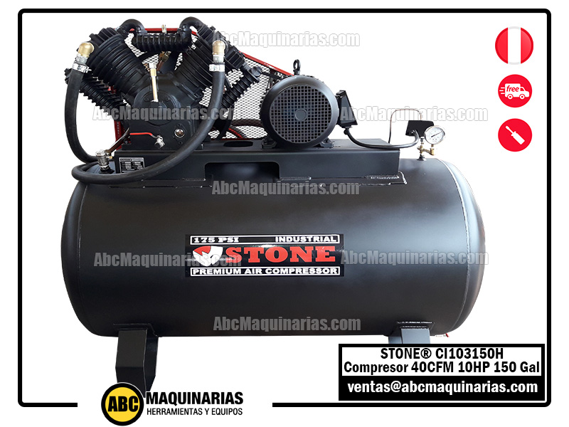 Compresor eléctrico de doble etapa STONE® con cabezal de fierro fundido, motor Weg® IP55 para servicio pesado.