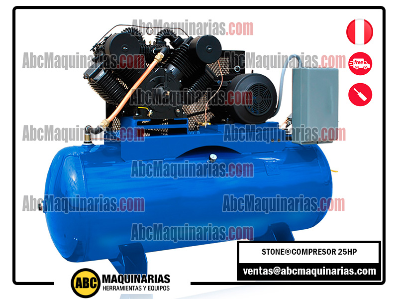 Compresor eléctrico de doble etapa STONE® con cabezal de fierro fundido, motor WEG® de alta eficiencia IP55.