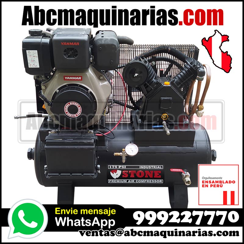Motocompresor de aire portátil con motor Diesel (Petrolero) YANMAR® con cabezal de fierro fundido de doble etapa hasta 12 bar de presión.