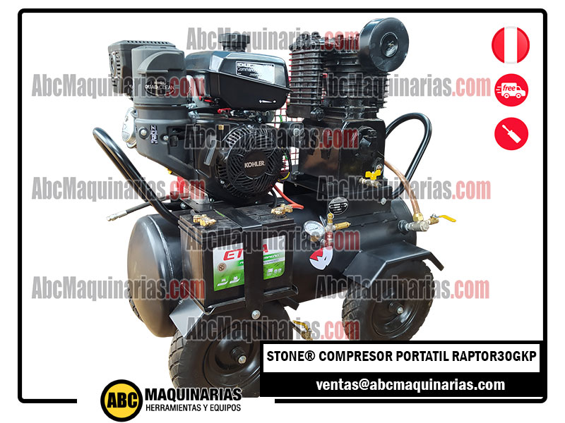 Motocompresor de aire autónomo y portátil con motor a Gasolina (Gasolinero) KOHLER® con cabezal de fierro fundido de doble etapa hasta 12 bar (175 PSI) de presión. Especialmente diseñado para servicios en campo, con ruedas de 15". Super compacto.